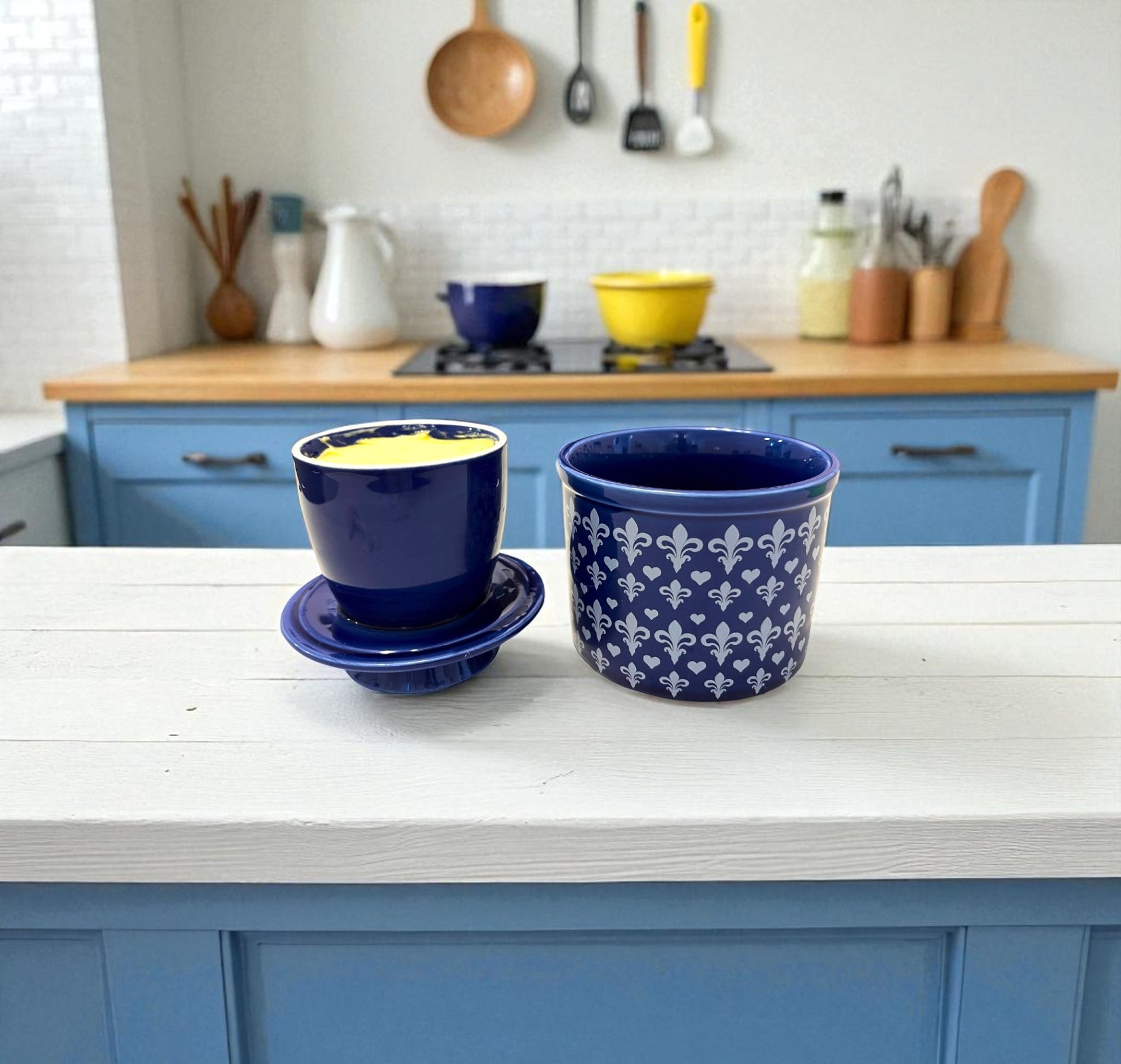 French Ceramic Butter Crock with Lid for Countertop - Blue Fleur